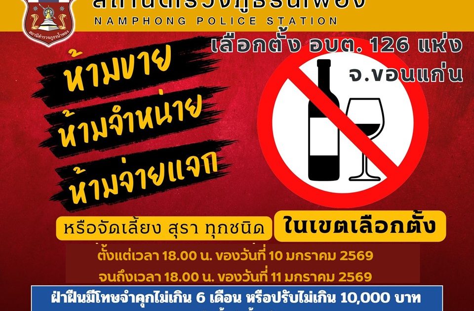 ประชาสัมพันธ์ ขอความร่วมมือผู้ประกอบการที่จำหน่ายสุราในเขตองค์การบริหารส่วนตำบลที่มีการเลือกตั้งทุกแห่ง ให้งดจำหน่าย จ่ายแจก หรือจัดเลี้ยงสุราในเขตองค์การบริหารส่วนตำบล ตั้งแต่เวลา 18.00 น. ของวันเสาร์ที่ 10 มกราคม 2569 (ก่อนเลือกตั้ง 1 วัน) ถึงเวลา 18.00 น. ของวันอาทิตย์ที่ 11 มกราคม 2569(วันเลือกตั้ง) ผู้ใดฝ่าฝืน มีโทษจำคุกไม่เกิน 6 เดือน หรือปรับไม่เกิน 10,000 บาท หรือทั้งจำทั้งปรับ