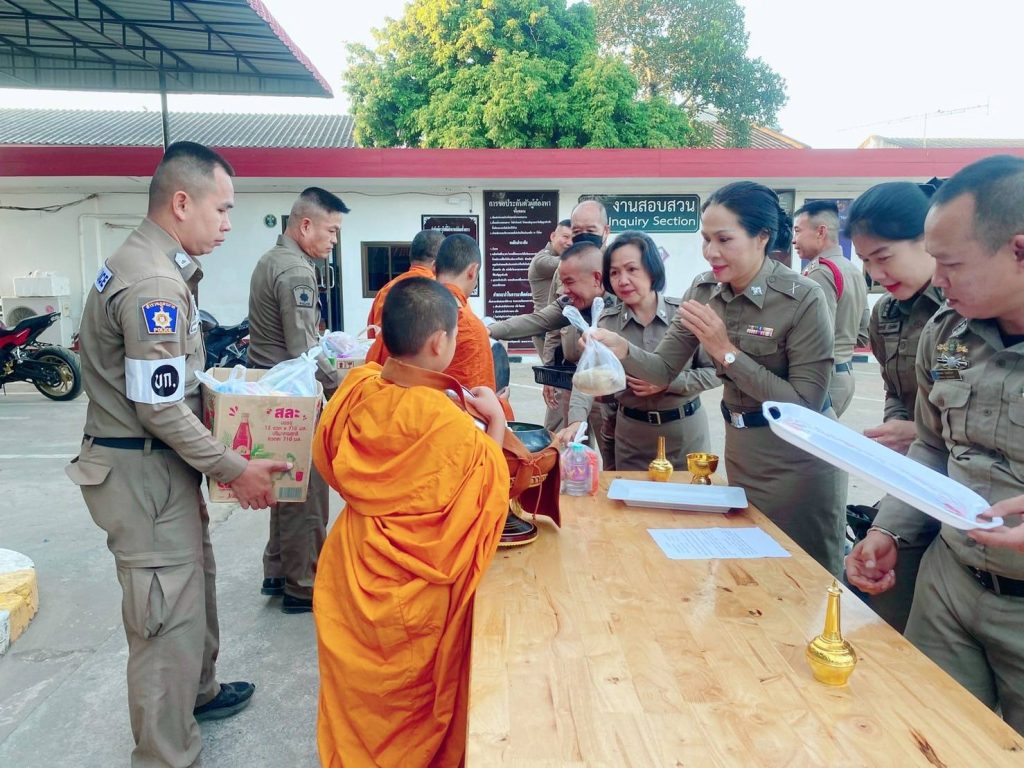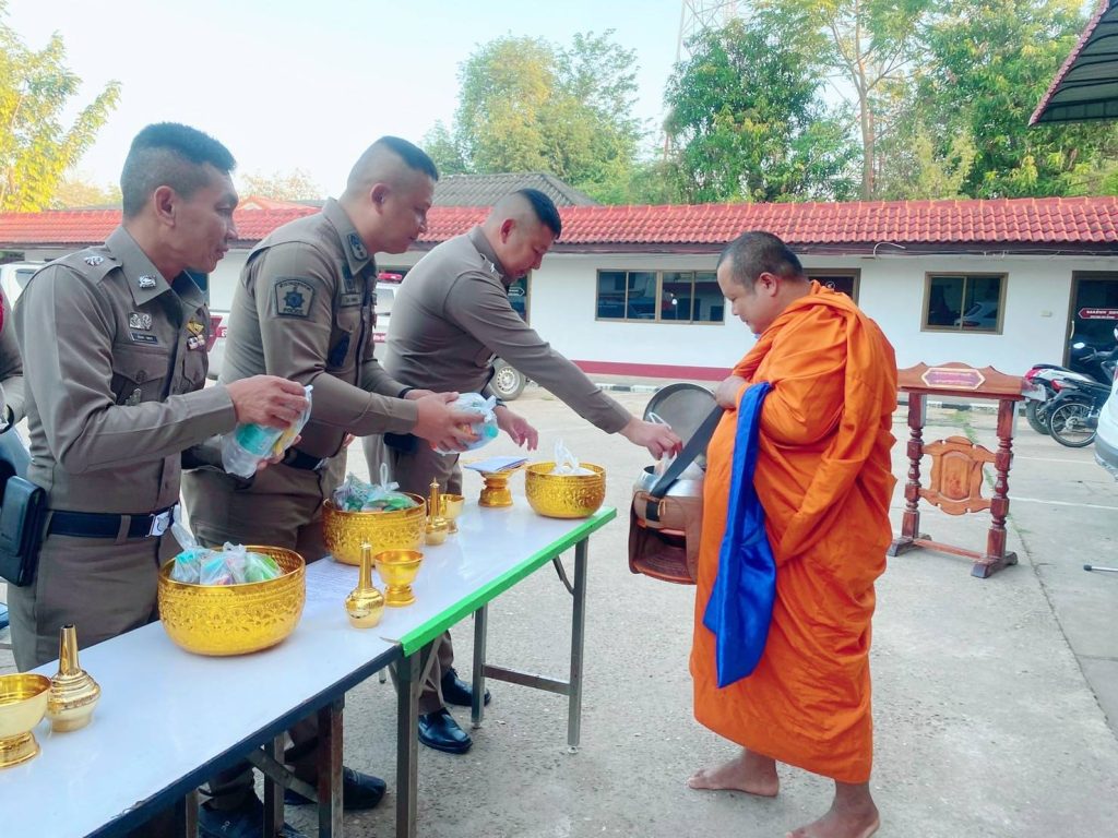 ร่วมทำบุญตักบาตรพระสงฆ์ 3 รูป ณ บริเวณ หน้า สภ.น้ำพอง