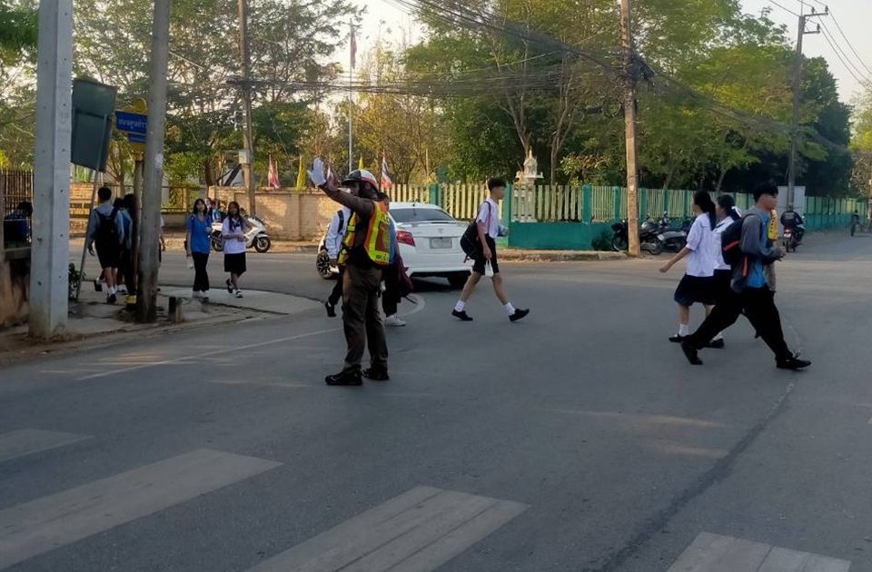 ส.ต.ท.ธีระพงษ์ ล่ามแขก พร้อมด้วย นสต.กิตติศักดิ์ ชายคำภา ออกปฏิบัติหน้าที่อำนวยความสะดวกการ จราจรหน้าโรงเรียนน้ำพองศึกษา