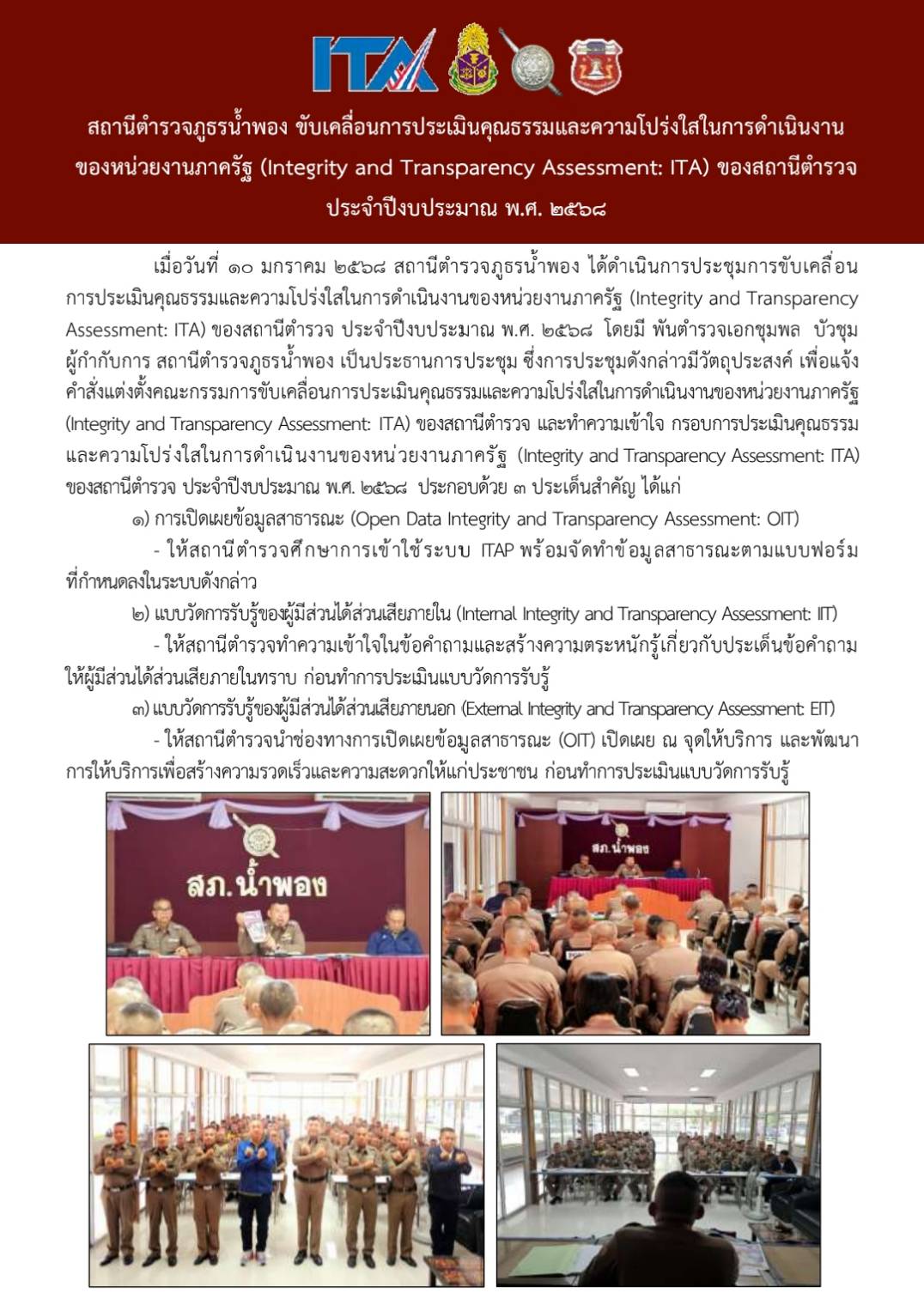 ประชุมขับเคลื่อนและติดตามการประเมินคุณธรรมและความโปร่งใสของหน่วยงานภาครัฐ ของสถานีตำรวจ Police ITA ประจำปีงบประมาณ 2568